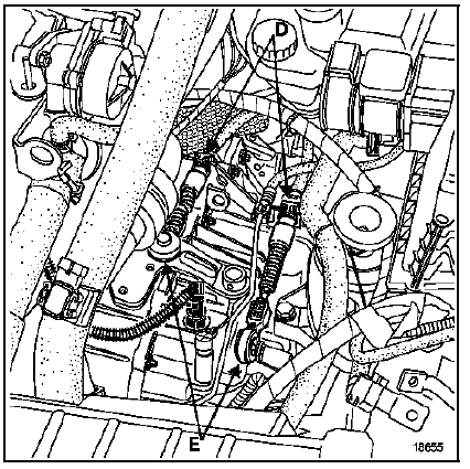 Retirer les agrafes (D) des câbles de commande externe des vitesses (E).