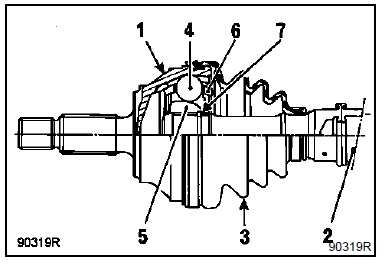 Ecarter l'anneau d'arrêt (7) et, simultanément, appliquer quelques coups de maillet sur la face frontale du moyeu à bille (5).